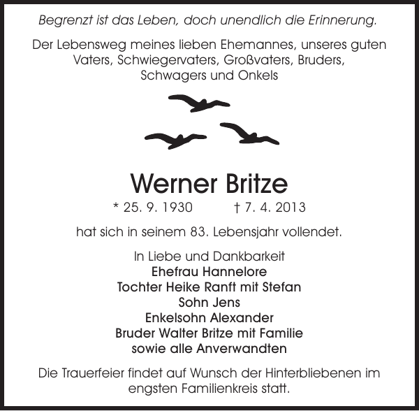Britze Werner Traueranzeige