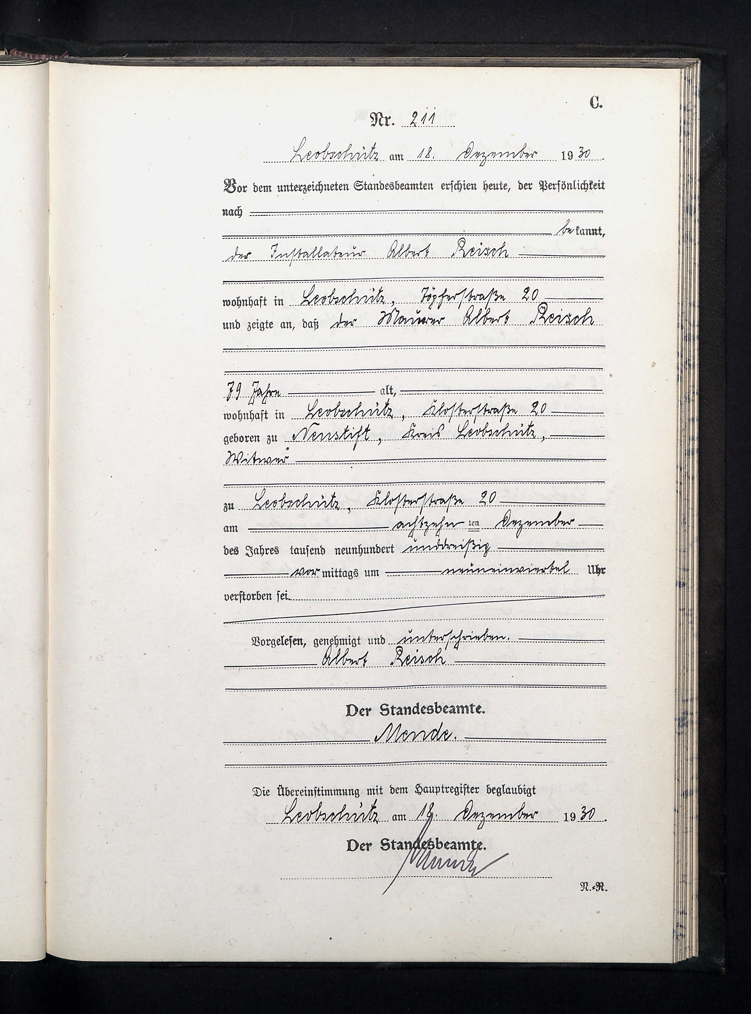 Reisch Albert Totenschein